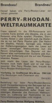 Im Jahr 1971 wurde die erste Perry Rhodan-Weltraumkarte durch den damaligen Perry Rhodan Service Wolfgang Wöhlisch vertrieben. Die Karte war vierfarbig und im Format 59 x 84 cm. Sie enthielt Angaben zu 87 astronomischen Objekten aus der Serie und kostete 5,80 DM.